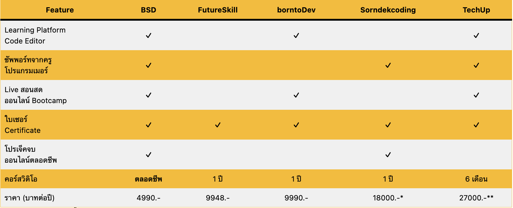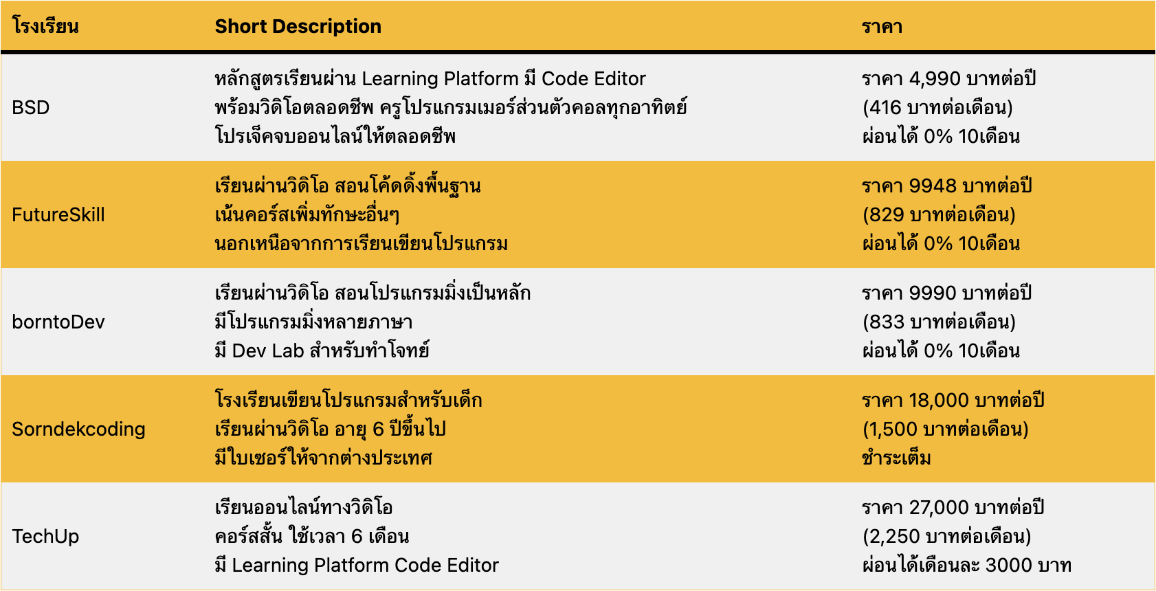 ทั้ง 5 โรงเรียนเขียนโปรแกรมในประเทศไทยปี 2024 ก็มีข้อที่เหมือนกันและแตกต่างกันไม่น้อย ด้วยเรื่องวิธีการสอน คอนเทนท์ในแต่ละหลักสูตร การซัพพอร์ทของครูโปรแกรมเมอร์ในระหว่างการเรียน ใบเซอร์ และค่าใช้จ่าย เราเลยทำตาราง feature ของแต่ละโรงเรียน เพื่อให้เห็นภาพได้ง่ายขึ้น