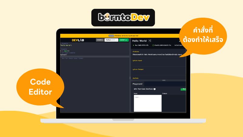 อีกทั้ง borntoDev ยังมีระบบที่มีการเปิด Access ให้กับผู้เรียนทุกคนในการเรียนรู้ได้ฝึกทำโจทย์ในการเขียนโค้ด ผู้เรียนสามารถเข้าถึงระบบตลอดเวลา สิ่งนี้จะช่วยให้ผู้เรียนสามารถได้พิมพ์โค้ดเองบน Dev Lab 3 ตามความความรู้การเขียนโปรแกรมมิ่งของตนเอง