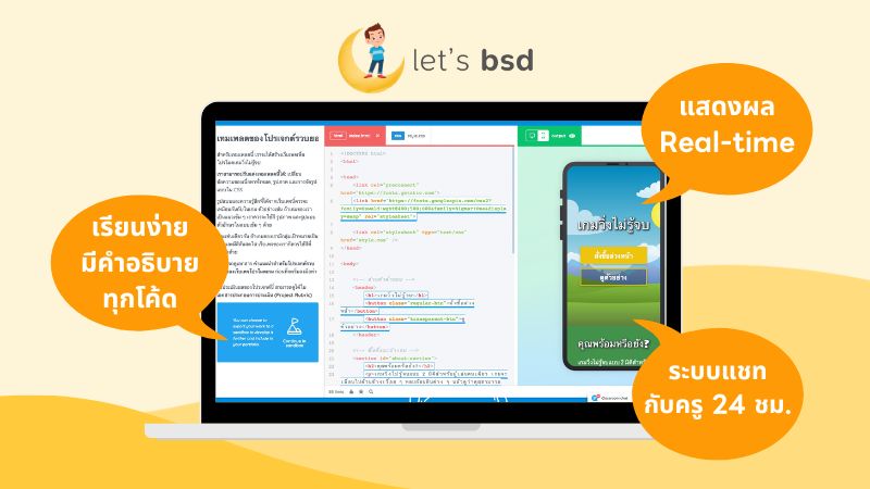 การทำแบบฝึกหัดที่ BSD จะทำผ่าน Learning Platform ที่มีหน้าต่าง Code Editor เมื่อนักเรียนเมื่อเขียนโค้ดเสร็จ จะมี Feedback ชี้จุดที่ยังบกพร่อง พร้อมคำแนะนําทางแก้ให้อย่าง Real-time ทำให้การเรียนเร็ว ง่าย และไม่มีสะดุด