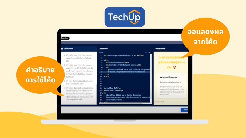 TechUp เป็นแพลตฟอร์มการเรียนรู้ที่ให้ผู้เรียนได้ฝึกทักษะต่าง ๆ ในการเขียนโปรแกรม โดยผ่านการอ่านเนื้อหาและดูวิดีโอที่ให้มาก่อนเข้าเรียนในคลาส ที่นี่มีหน้าต่าง Code Editor ที่สามารถเขียนโค้ดเพื่อทำแบบฝึกหัดได้ และเมื่อเขียนโค้ดเสร็จแล้ว ระบบจะให้ Feedback โดยชี้จุดที่ยังมีบกพร่องอยู่ และแนะนำทางการแก้ไขให้แบบ Real-time เพื่อช่วยให้ผู้เรียนสามารถพัฒนาทักษะได้อย่างต่อเนื่อง